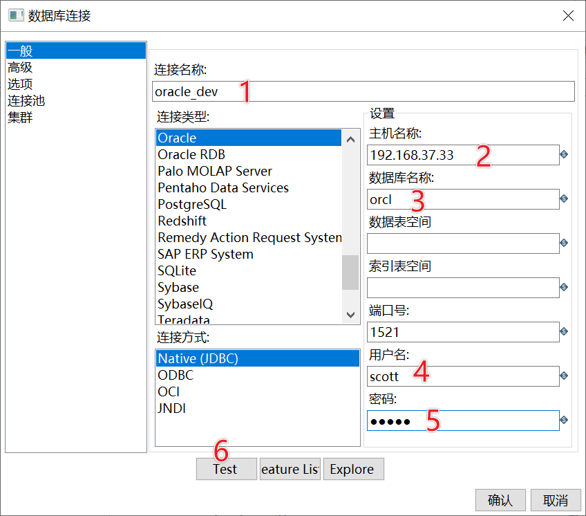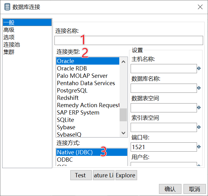 连接名称,这里仅仅是一个连接的名称,而这个名称背后代表了一个连接串,而且连接Oracle、MySQL的配置方法类似,但是需要不同的jar包。