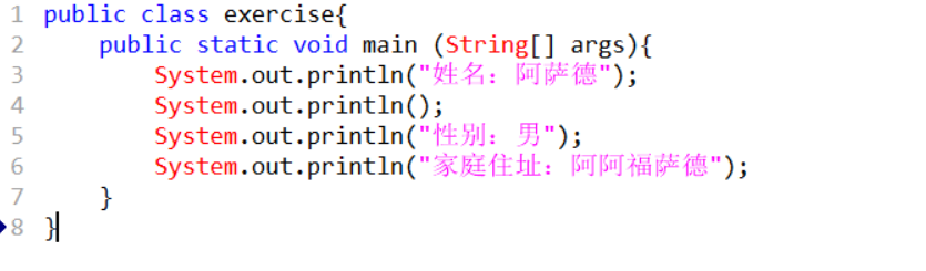 System.out.println("姓名:阿萨德\n") 内容后加 \n