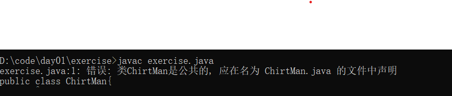 解决办法:java源代码文件名错了,应该与声明的class类一致,将exetcise改为ChirtMan.java就可以了。但如果声明的class非public则文件名无需与类名相同。错误3