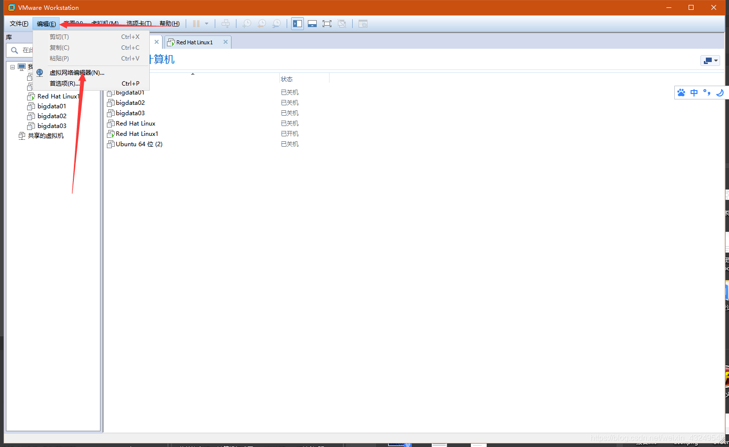 打开VM,按照箭头指示,选择虚拟网络编辑器栏。
