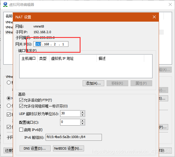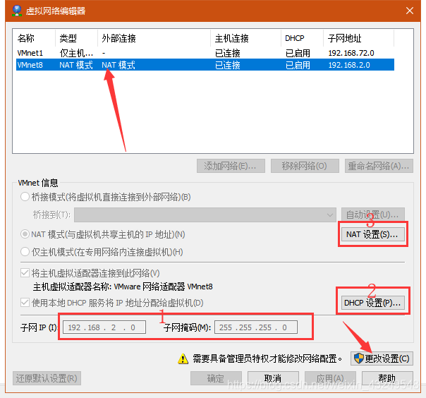 点击NAT模式,然后选择更改设置(因为需要管理员权限),然后就可以开始配置红框中的数据了,我们按照顺序来。