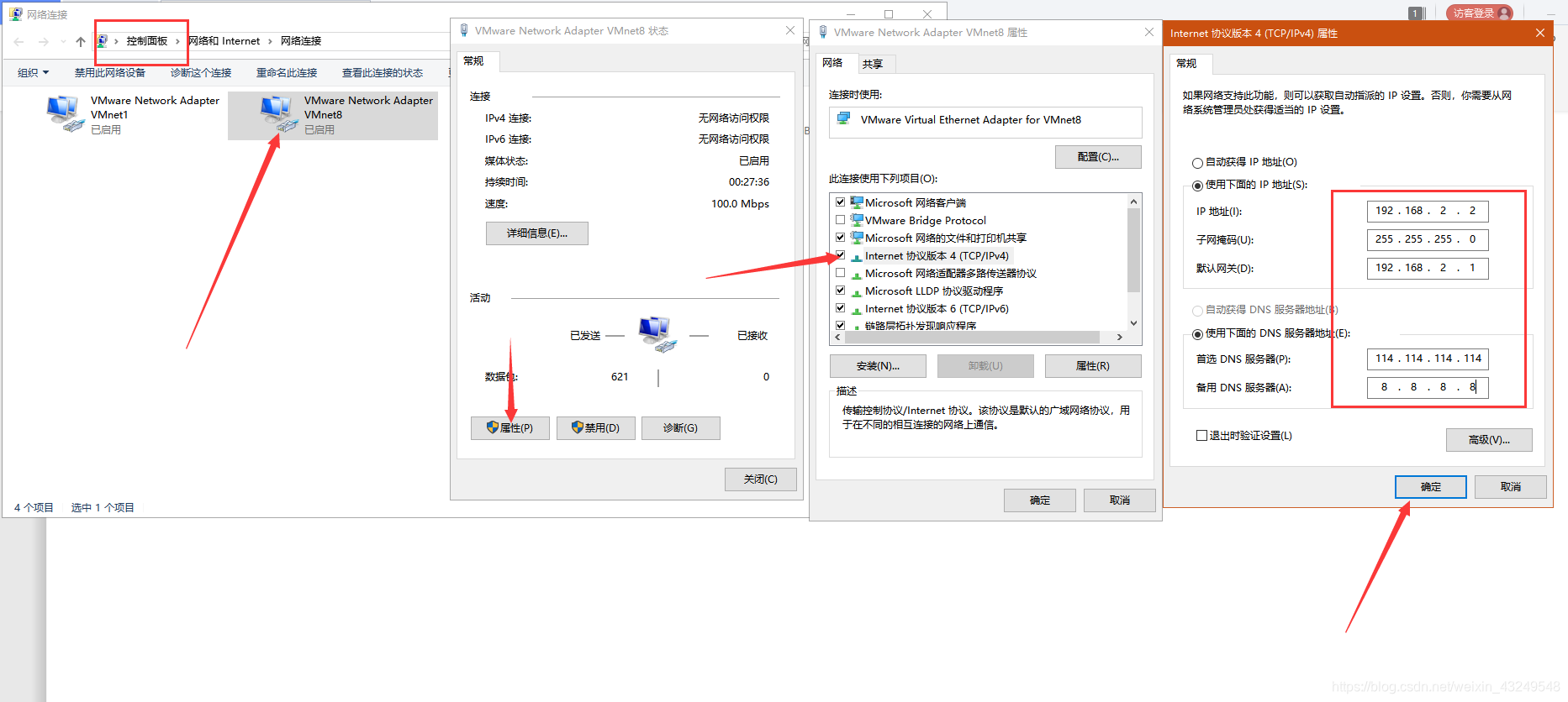 看图吧,进入控制面板,网络连接,找到NET 8网卡,找到属性,找到ipv4,然后将其配置为与刚刚一样的即可。