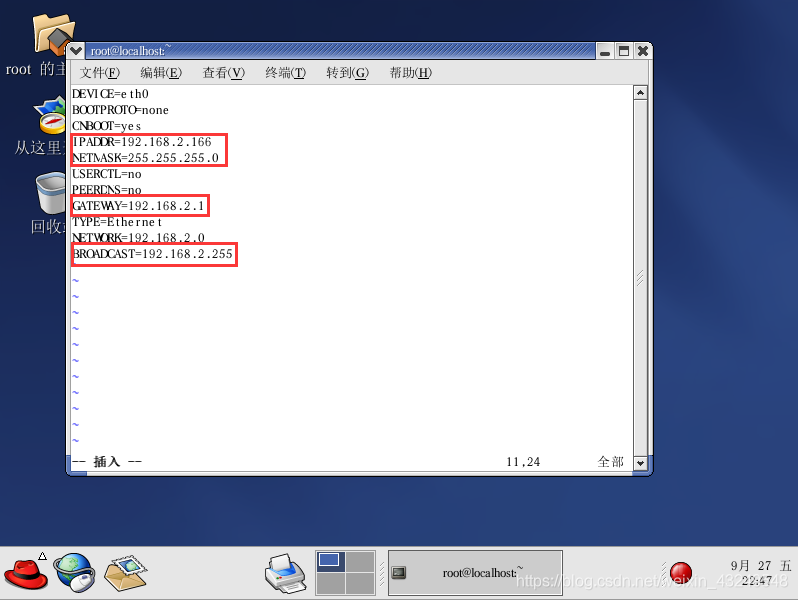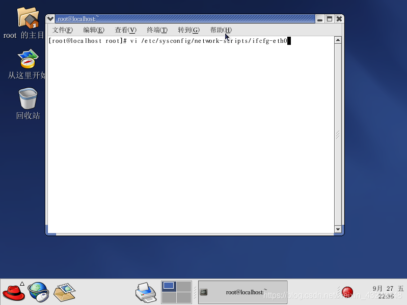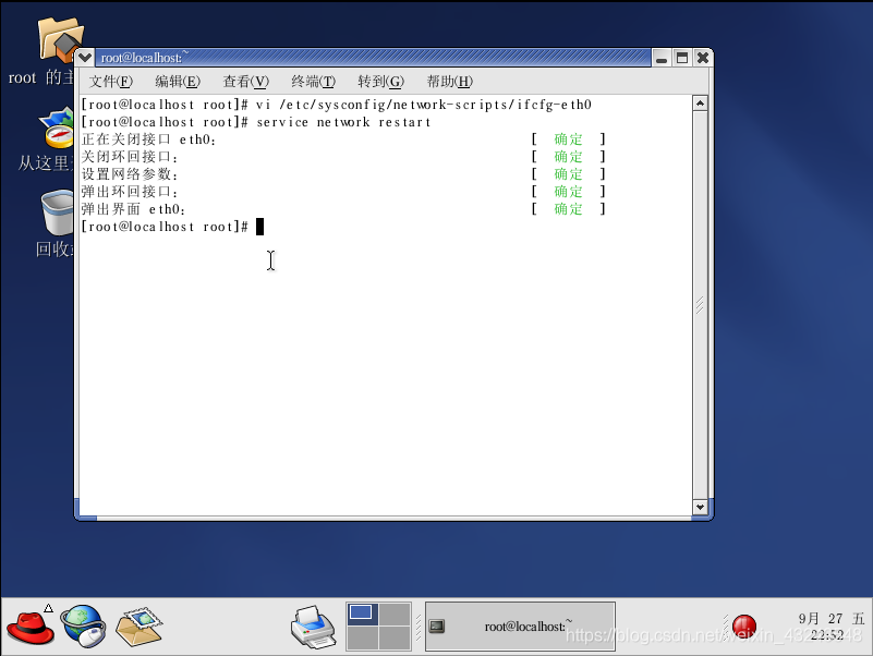 此时,我们外界的准备工作做完了,接下来进入redhat,配置其网络即可。在终端输入