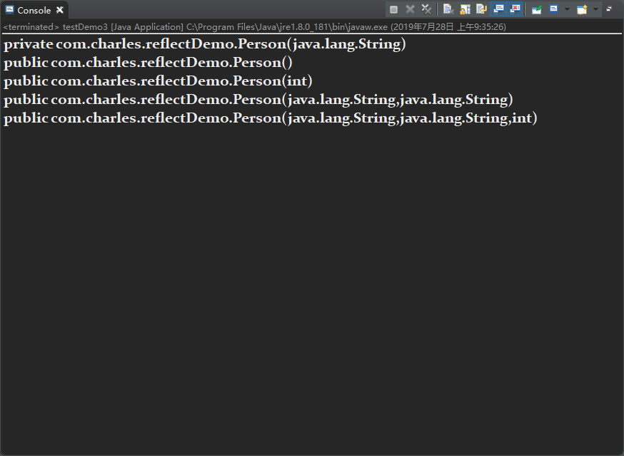 执行结果如下图:(这里就不解释了,博文1里面已经提到,这里我们只是用来展示该类的所有构造方法,观察得知,一共有3个公有带参,一个公有无参,1个私有带参,,后面我们用它们来做示例)