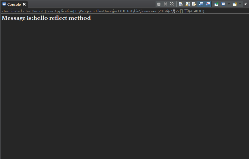 执行结果如图所示:(完成了对象的实例化,并且成功调用方法)通过Class对象的newInstance方法来得到一个Object对象,经过强转成为reflectDemo对象;用该对象调用该类成员方法即可!