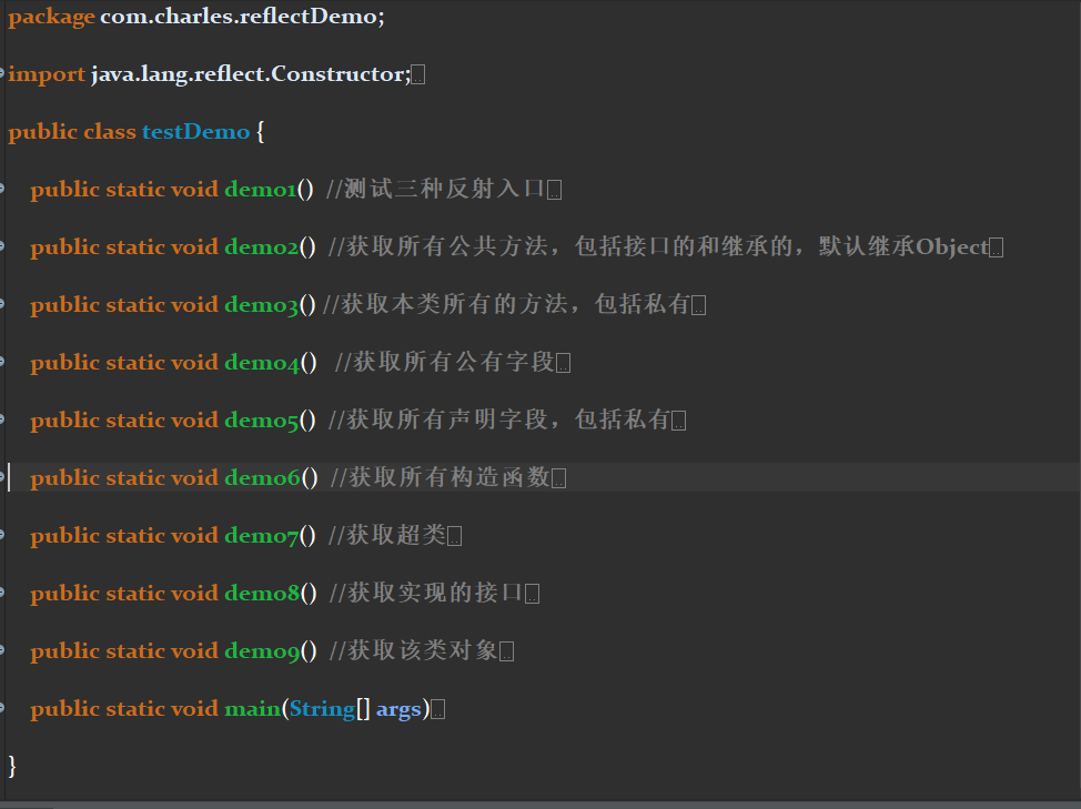 接下来我们创建测试类testDemo.java,该类一共有9个定义的方法,我们用来分别main方法中测试: