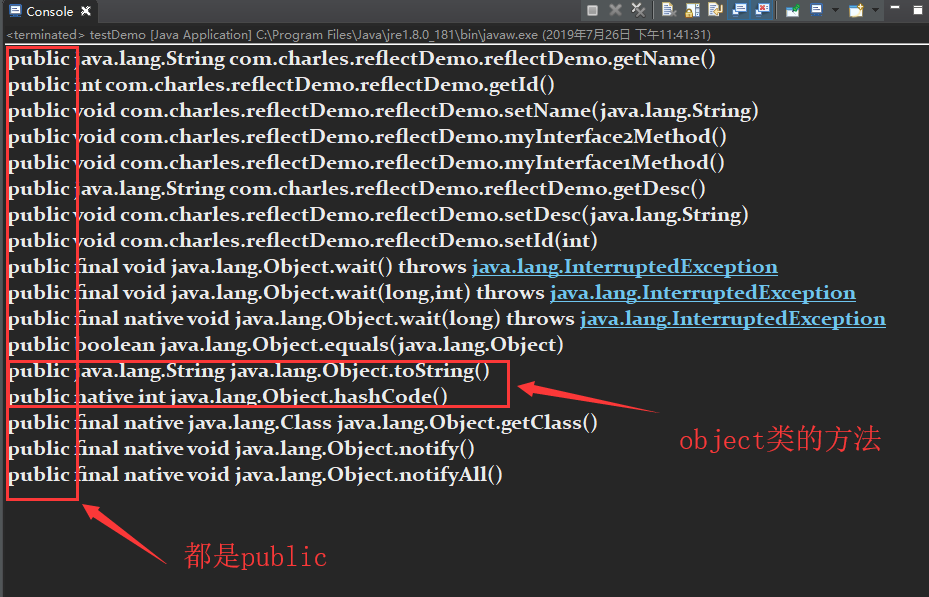 public static void demo2() //获取所有公共方法,包括接口的和继承的,默认继承Object