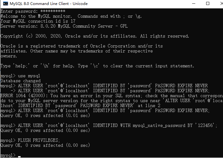 use mysql ALTER USER 'root'@'localhost' IDENTIFIED BY 'password' PASSWORD EXPIRE NEVER; #更改加密方式 ALTER USER 'root'@'localhost' IDENTIFIED WITH mysql_native_password BY 'password'; #更新用户密码 FLUSH PRIVILEGES; #刷新权限
