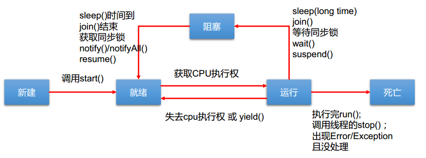 - 就绪: 处于新建状态的线程被start()后,将进入线程队列等待CPU时间片,此时它已具备了运行的条件,只是没分配到CPU资源