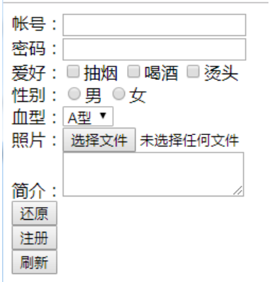 <body> <form action="baidu" method="GET"> <p> 账号: <input type="text" placeholder="请输入账号..." maxlength="5"> </p> <p> 密码: <input type="password"> </p> <p> 爱好: <input type="checkbox" name="hobby" id="1">抽烟 <input type="checkbox" name="hobby" id="1" checked="checked">喝酒 <input type="checkbox" name="hobby" id="1">烫头 <input type="checkbox" name="hobby" id="1">泡脚 </p> <p> 性别: <input type="radio" name="sex"> 男 <input type="radio" name="sex"> 女 </p> <p> 血型: <select name="blood" > <option selected="selected">A型</option> <option>B型</option> <option>AB型</option> <option>O型</option> </select> </p> <P> 照片: <input type="file"> </P> <p> 简介: <textarea rows="10" cols="30"></textarea> </p> <p> <input type="reset" value="还原" > </p> <p> <input type="submit" value="提交" > </p> <p> <input type="button" value="刷新" > </p> </form> <button name="back">返回</button> </body>