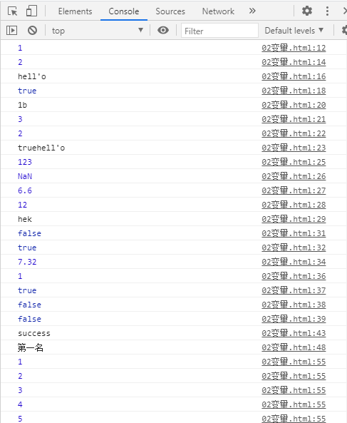 <!DOCTYPE html> <html lang="en"> <head> <meta charset="UTF-8"> <meta name="viewport" content="width=device-width, initial-scale=1.0"> <meta http-equiv="X-UA-Compatible" content="ie=edge"> <title>Document</title> </head> <script> //数值类型 var a=1; console.log(a); var b=2.0; console.log(b); var c='hell\'o'; console.log(c); var d= true; console.log(d); //自动转换 console.log(a+'b'); //1b console.log(a+b); //3 console.log(d+a); //2 console.log(d+c);//truehell\'o //强制转换 console.log(parseInt("123")); //123 console.log(parseInt("hello"));//NaN console.log(parseFloat("6.6"));//6.6 console.log(parseFloat("12"));//12 console.log('hek');//NaN //严格关系 console.log(a==="1");//false console.log(a=="1.0");//true //算术运算 console.log(a+6.32);//7.32 //逻辑运算 console.log(a||1.0==1);//1 console.log(2==="2.0"||1.0==1);//true console.log(!a==1.0);//false console.log(true&&a==='1.0');//false //循环 //if else var e=39; if(e>20) console.log("success"); else console.log("fail"); //switch case var f=1; switch(f){ case 1: console.log("第一名");break; case 2: console.log("第二名");break; case 3: console.log("第三名");break; default: console.log("不及格"); } //for for(var i=1;i<=10;i++){ console.log(i); } //while var j=10; while (j>0){ console.log(j); j--; } </script> <body> </body> </html>