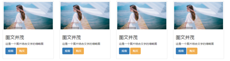 <!DOCTYPE html> <html lang="en"> <head> <meta charset="UTF-8"> <meta name="viewport" content="width=device-width, initial-scale=1.0"> <link rel="stylesheet" href="css/bootstrap.min.css"> <title>Document</title> </head> <style> </style> <body style="padding: 100px;"> <!-- col-lg-3 当大屏幕时,一个div占3份,一行显示4个div --> <!-- col-md-4 当中屏幕时,一个div占4份,一行显示3个div --> <!-- col-sm-6 当小屏幕时,一个div占6份,一行显示2个div --> <!-- 超小屏幕时,一个div占12份,一行显示1个div,默认 --> <div class="container"> <div class="rows"> <div class="col-lg-3 col-md-4 col-sm-6"> <div class="thumbnail"> <img src="img/2.jpg"> <div class="caption"> <h3>图文并茂</h3> <p>这是一个图片结合文字的缩略图</p> <a href="#" class="btn btn-primary">观看</a> <a href="#" class="btn btn-warning">购买</a> </div> </div> </div> <div class="col-lg-3 col-md-4 col-sm-6"> <div class="thumbnail"> <img src="img/2.jpg"> <div class="caption"> <h3>图文并茂</h3> <p>这是一个图片结合文字的缩略图</p> <a href="#" class="btn btn-primary">观看</a> <a href="#" class="btn btn-warning">购买</a> </div> </div> </div> <div class="col-lg-3 col-md-4 col-sm-6"> <div class="thumbnail"> <img src="img/2.jpg"> <div class="caption"> <h3>图文并茂</h3> <p>这是一个图片结合文字的缩略图</p> <a href="#" class="btn btn-primary">观看</a> <a href="#" class="btn btn-warning">购买</a> </div> </div> </div> <div class="col-lg-3 col-md-4 col-sm-6"> <div class="thumbnail"> <img src="img/2.jpg"> <div class="caption"> <h3>图文并茂</h3> <p>这是一个图片结合文字的缩略图</p> <a href="#" class="btn btn-primary">观看</a> <a href="#" class="btn btn-warning">购买</a> </div> </div> </div> </div> </body> <script src="js/jquery-3.3.1.min.js"></script> <script src="js/bootstrap.min.js"></script> </html>