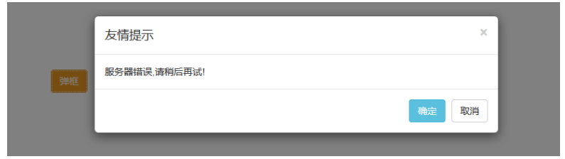 <!DOCTYPE html> <html lang="en"> <head> <meta charset="UTF-8"> <meta name="viewport" content="width=device-width, initial-scale=1.0"> <link rel="stylesheet" href="css/bootstrap.min.css"> <title>Document</title> </head> <body style="padding: 100px;"> <button class="btn btn-warning" data-toggle="modal" data-target="#modal">弹框</button> <!-- 声明定义模态框组件--> <div class="modal" id='modal' data-backdrop="static"> <!-- 窗口声明 --> <div class="modal-dialog"> <!-- 内容声明 --> <div class="modal-content"> <!-- 1.框的标题 --> <div class="modal-header"> <button class="close" data-dismiss="modal"> <span>×</span></button> <h3 class="modal-title">友情提示</h3> </div> <!-- 2.框内信息 --> <div class="modal-body"> 服务器错误,请稍后再试! <hr> <img src="img/2.jpg" width="200px"> </div> <!-- 3.框的按钮 --> <div class="modal-footer"> <button class="btn btn-info">确定</button> <button class="btn btn-info" data-dismiss="modal">取消</button> </div> </div> </div> </div> </body> <script src="js/jquery-3.3.1.min.js"></script> <script src="js/bootstrap.min.js"></script> </html>