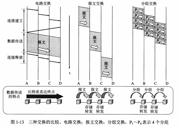 - 报文交换---整个报文先传送到相邻结点,全部存储后在查找转发表,转发到下一个结点
