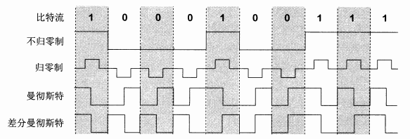 - 曼彻斯特编码:位周期中心的向上跳变表示0,向下跳变表示1