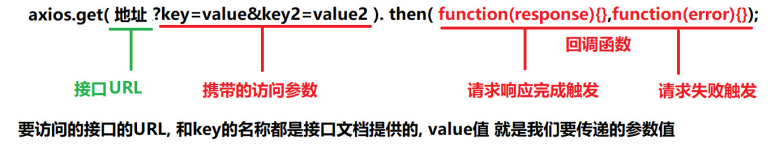 <!-- get--> axios.get(地址?key=value&key2=value2).then(function(response){},function(error) {}); <!--post --> axios.post(地址,{key:value,key2:value2}).then(function(response) {},function(error){})