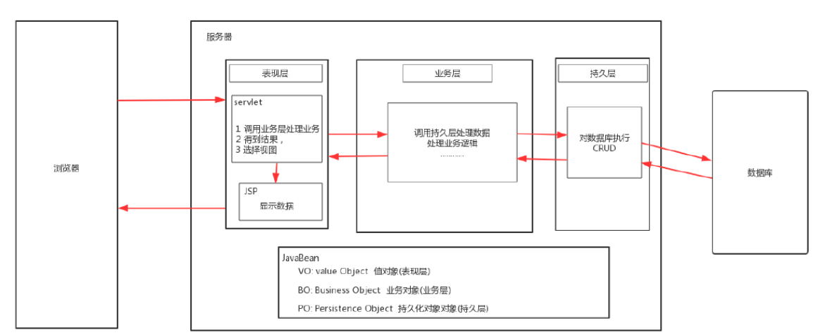 - 表现出调研业务层,业务层调用持久层,利用javabean实体对象传递数据
