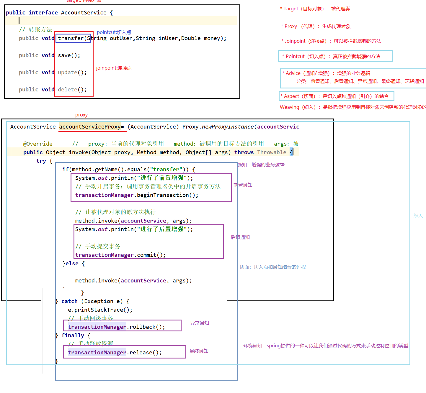 解决方案:代理模式,将业务代码和事务代码进行拆分,通过动态代理的方式,对业务方法进行事务的增强