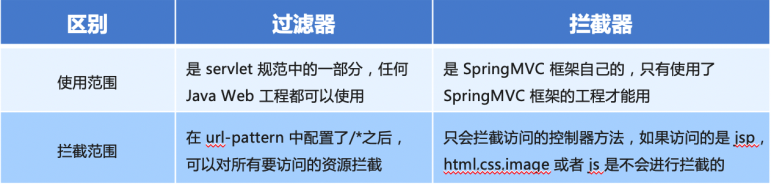 - springMVC拦截器类似于servlet开发中的过滤器Filter,用于对处理器进行预处理和后处理