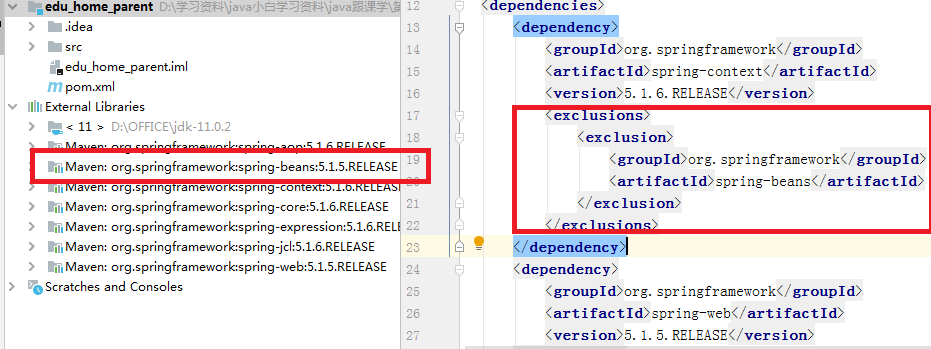 - 解决二:排除依赖,使用exclusions标签将传递过来的依赖排除