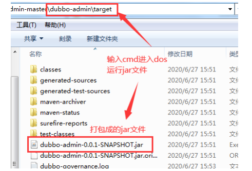 - 在dos下运行target目录中的jar文件:java -jar dubbo-admin-0.0.1-SNAPSHOT.jar