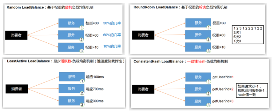 - 服务消费者,从提供者地址列表中,基于软负载均衡算法,选一台提供者进行调用,如果调用失败,再选另一台调用