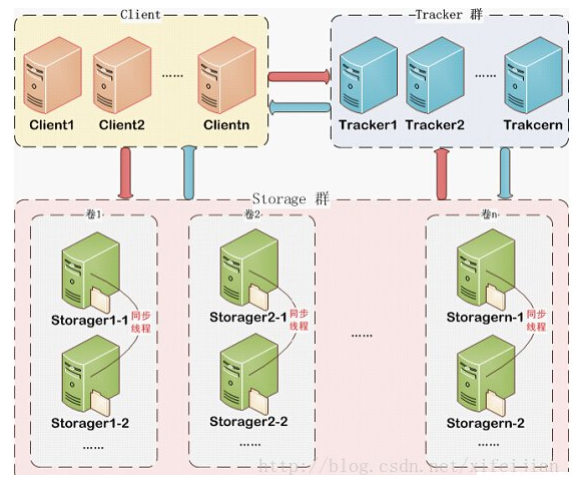 - Storage:文件存储,客户端上传的文件最终存储到Storage服务器上,Storage集群采用分组的方式,同组内的每台服务器是平等关系,数据同步,实现数据备份,从而高可用,不同组的服务器不通信,同组内的服务器存储量不一致时,遵循最小原则