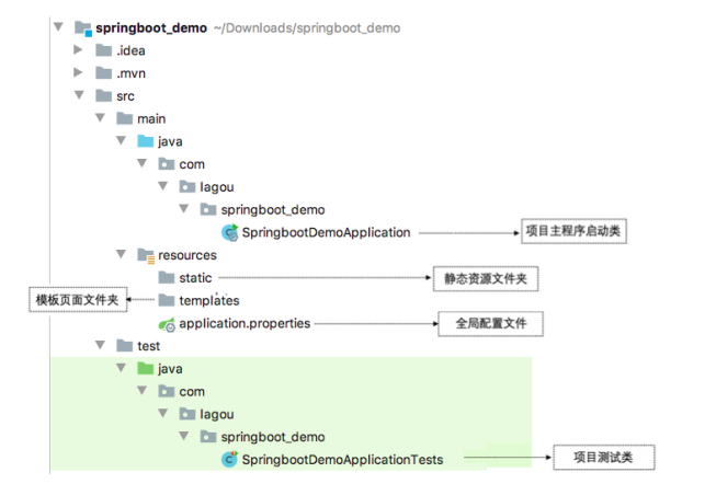- 项目结构:使用Spring Initializr方式构建的Spring Boot项目会默认生成项目启动类、存放前端静态资源和页面的文件夹、编写项目配置的配置文件以及进行项目单元测试的测试类