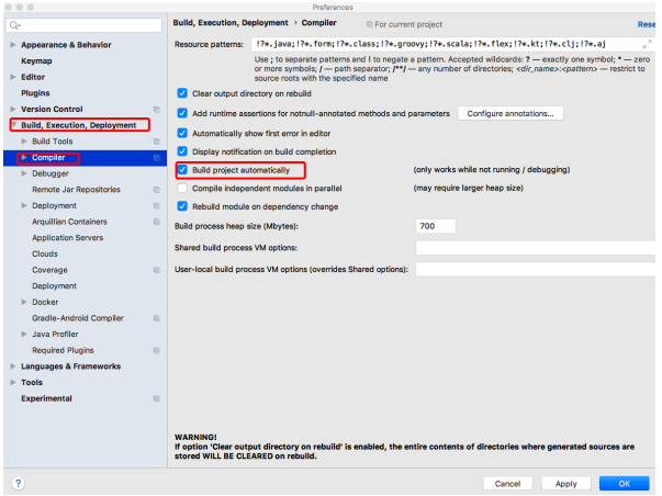 - 开启idea的自动编译:选择Build下的Compiler选项,在右侧勾选“Build project automatically”选项将项目设置为自动编译,单击【Apply】→【OK】按钮保存设置
