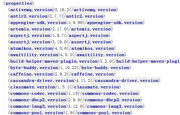 - spring-boot-dependencies底层源文件通过标签对一些常用技术框架的依赖文件进行了统一版本号管理,例如activemq、spring、tomcat等,都有与Spring Boot 2.2.2版本相匹配的版本