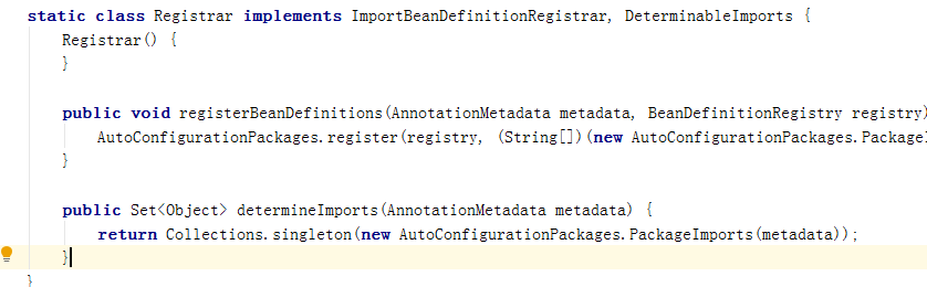 - @AutoConfigurationPackage注解:由@Import注解实现的,它是spring框架的底层注解,它的作用就是给容器中导入某个组件类,例如@Import(AutoConfigurationPackages.Registrar.class),它就是将Registrar这个组件类导入到容器中,registerBeanDefinitions()方法是导入组件类的具体实现
