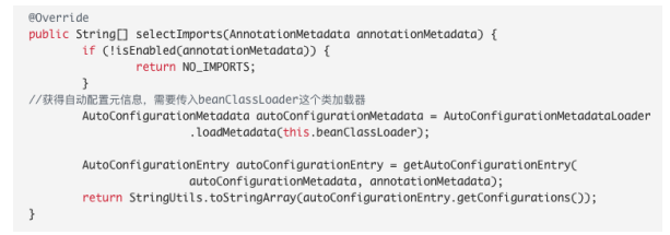 - AutoConfigurationImportSelector 可以帮助 Springboot 应用将所有符合条件的 @Configuration配置都加载到当前 SpringBoot 创建并使用的 IOC 容器( ApplicationContext )中,通过selectImports这个方法告诉springboot都需要导入那些组件