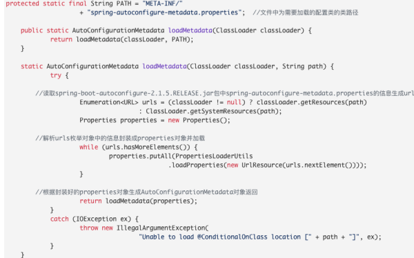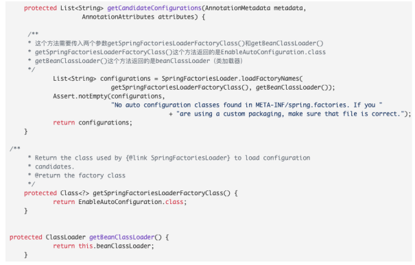 public static List<String> loadFactoryNames(Class<?> factoryClass, @Nullable ClassLoader classLoader) { //获取出入的键 String factoryClassName = factoryClass.getName(); return (List)loadSpringFactories(classLoader).getOrDefault(factoryClassName, Collections.emptyList()); } p rivate static Map<String, List<String>> loadSpringFactories(@Nullable ClassLoader classLoader) { MultiValueMap<String, String> result = (MultiValueMap)cache.get(classLoader); if (result != null) { return result; } else { try { //如果类加载器不为null,则加载类路径下spring.factories文件,将其中设置的配置类的全路径信息封装 为Enumeration类对象 Enumeration<URL> urls = classLoader != null ? classLoader.getResources("META-INF/spring.factories") : ClassLoader.getSystemResources("META-INF/spring.factories"); LinkedMultiValueMap result = new LinkedMultiValueMap(); //循环Enumeration类对象,根据相应的节点信息生成Properties对象,通过传入的键获取值,在将值切割为一个个小的字符串转化为Array,方法result集合中 while(urls.hasMoreElements()) { URL url = (URL)urls.nextElement(); UrlResource resource = new UrlResource(url); Properties properties = PropertiesLoaderUtils.loadProperties(resource); Iterator var6 = properties.entrySet().iterator();while(var6.hasNext()) { Entry<?, ?> entry = (Entry)var6.next(); String factoryClassName = ((String)entry.getKey()).trim(); String[] var9 = StringUtils.commaDelimitedListToStringArray((String)entry.getValue()); int var10 = var9.length; for(int var11 = 0; var11 < var10; ++var11) { String factoryName = var9[var11]; result.add(factoryClassName, factoryName.trim()); } } } cache.put(classLoader, result); return result;