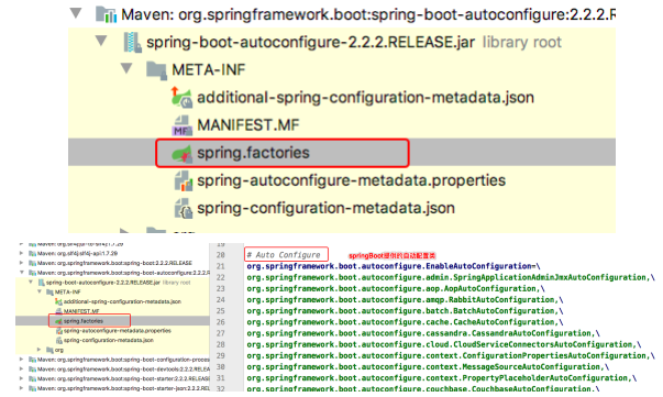 中,会使用内部工具类SpringFactoriesLoader,查找classpath上所有jar包中的METAINF/spring.factories进行加载,实现将配置类信息交给SpringFactory加载器进行一系列的容器创建过程