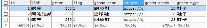 CREATE TABLE products( id INT PRIMARY KEY AUTO_INCREMENT, NAME VARCHAR(50), #商品名称 price DOUBLE, flag VARCHAR(2), #上架状态 goods_desc VARCHAR(100), #商品描述 images VARCHAR(400), #商品图片 goods_stock INT, #商品库存 goods_type VARCHAR(20) #商品类型 );