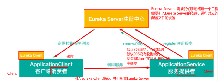 Server中获取到服务注册信息,进行服务调用 - 微服务启动后,会周期性地向Eureka Server发送心跳(默认周期为30秒,默认Eureka Server90S会将还没有续约的给剔除)以续约自己的信息