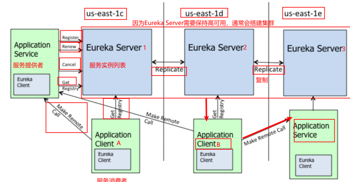 - 图中Application Service作为服务提供者向Eureka Server中注册服务,Eureka Server接受到注册事件会在集群和分区中进行数据同步,Application Client作为消费端(服务消费者)可以从Eureka