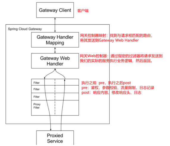 - 客户端向Spring Cloud GateWay发出请求,然后在GateWay Handler Mapping中找到与请求相匹配的路由,将其发送到GateWay Web Handler;