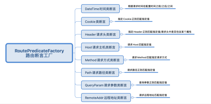 - Spring Cloud GateWay 帮我们内置了很多 Predicates功能,实现了各种路由匹配规则(通过Header、请求参数等作为条件)匹配到对应的路由。