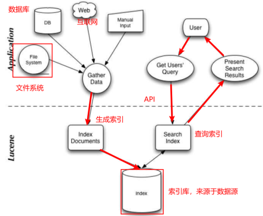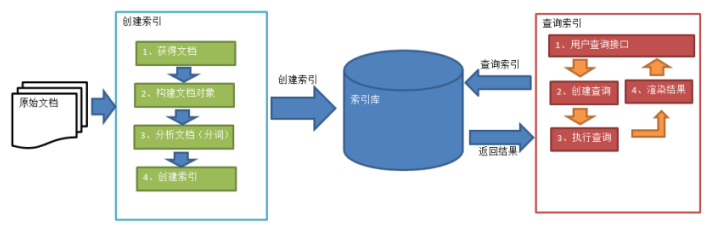 - 红色表示搜索过程,从索引库中搜索内容,搜索过程包括:用户通过搜索界面-->创建查询-->执行搜索,从索引库搜索-->渲染搜索结果