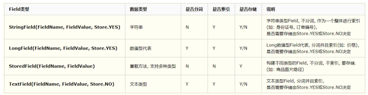 - Field:一个Document可以包含多个信息域,有两个属性可选:存储和索引。通过存储属性你可以控制是否对这个Field进行存储;通过索引属性你可以控制是否对该Field进行索引。