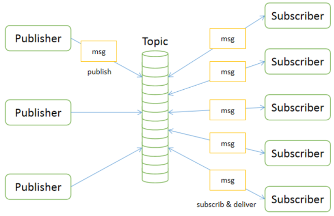 - 消息生产者(发布)将消息发布到topic中,同时有多个消息消费者(订阅)消费该消息。和点对点方式不同,发布到topic的消息会被多个订阅者消费