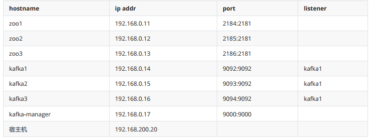 192.168.200.20 kafka1 192.168.200.20 kafka2 192.168.200.20 kafka3 192.168.200.11 node1 192.168.200.12 node2 192.168.200.13 node3