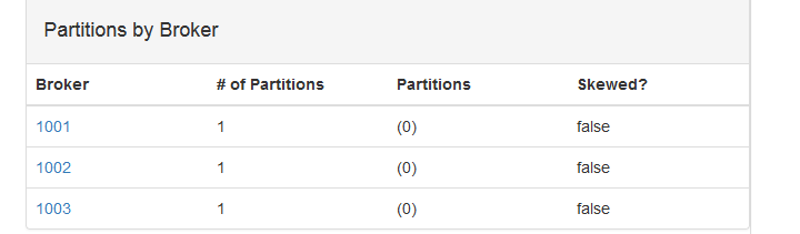 #查看topic主题详情,Zookeeper节点写一个和全部写,效果一致 kafka-topics.sh --describe --zookeeper zoo1:2181,zoo2:2181,zoo3:2181 --topic test #结果列表 Topic: test1 PartitionCount: 3 ReplicationFactor: 3 Configs: Topic: test1 Partition: 0 Leader: 1001 Replicas: 1001,1003,1002 Isr: 1001,1003,1002 Topic: test1 Partition: 1 Leader: 1002 Replicas: 1002,1001,1003 Isr: 1002,1001,1003 Topic: test1 Partition: 2 Leader: 1003 Replicas: 1003,1002,1001 Isr: 1003,1002,1001