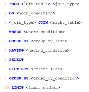 1. FORM子句 : 左右两个表的笛卡尔积 2. ON: 筛选满足条件的数据 3. JOIN: 如果是 inner join 那就正常,如果是 outer join 则会添加回来上面一步过滤掉的一些行 4. WHERE: 对不满足条件的行进行移除, 并且不能恢复 5. GROUP BY: 分组后只能得到每组的第一行数据,或者聚合函数的数值 6. HAVING: 对分组后的数据进行筛选 7. SELECT: 执行select操作,获取需要的列。 8. DISTINCT: 去重 9. ORDER BY: 排序 10. LIMIT:取出指定行的记录, 并将结果返回。