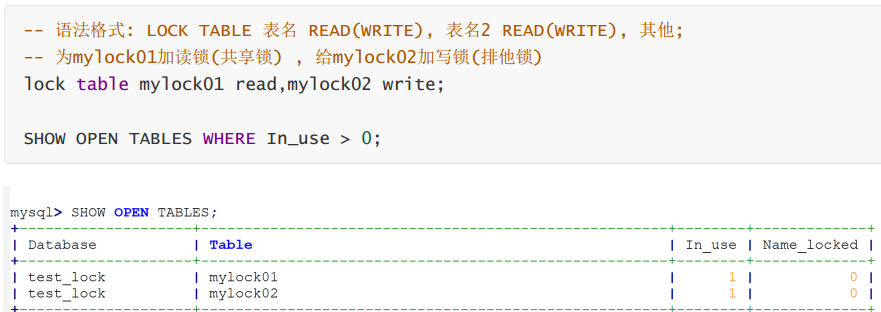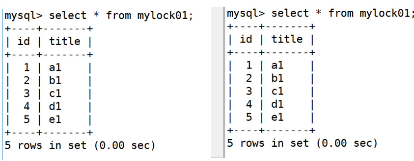 - 开启两个窗口,对mylock01进行读操作, 两个窗口都可以读;select * from mylock01