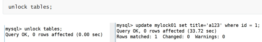 - 在窗口1中 对mylock01表加写 :lock table mylock01 write