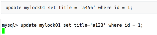 -- 创建数据库 CREATE DATABASE test_lock CHARACTER SET 'utf8'; -- 创建表,选择 MYISAM存储引擎 CREATE TABLE mylock01( id INT PRIMARY KEY AUTO_INCREMENT, title VARCHAR(20) )ENGINE MYISAM; -- 创建表 CREATE TABLE mylock02( id INT PRIMARY KEY AUTO_INCREMENT, title VARCHAR(20) )ENGINE MYISAM; -- mylock01表中向插入数据 INSERT INTO mylock01(title) VALUES('a1'); INSERT INTO mylock01(title) VALUES('b1'); INSERT INTO mylock01(title) VALUES('c1'); INSERT INTO mylock01(title) VALUES('d1'); INSERT INTO mylock01(title) VALUES('e1'); -- mylock02表中向插入数据 INSERT INTO mylock02(title) VALUES('a'); INSERT INTO mylock02(title) VALUES('b'); INSERT INTO mylock02(title) VALUES('c'); INSERT INTO mylock02(title) VALUES('d'); INSERT INTO mylock02(title) VALUES('e'); SELECT * FROM mylock01;