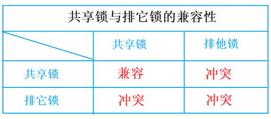 - 共享锁只能兼容共享锁, 不兼容排它锁