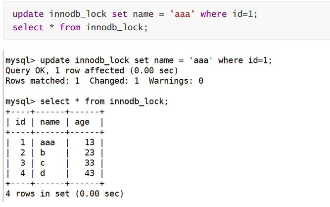 #创建表 CREATE TABLE innodb_lock( id INT PRIMARY KEY AUTO_INCREMENT, NAME VARCHAR(20), age INT, INDEX idx_name(NAME) ); # 插入数据 INSERT INTO innodb_lock VALUES(NULL,'a', 13); INSERT INTO innodb_lock VALUES(NULL,'b', 23); INSERT INTO innodb_lock VALUES(NULL,'c', 33); INSERT INTO innodb_lock VALUES(NULL,'d', 43);
